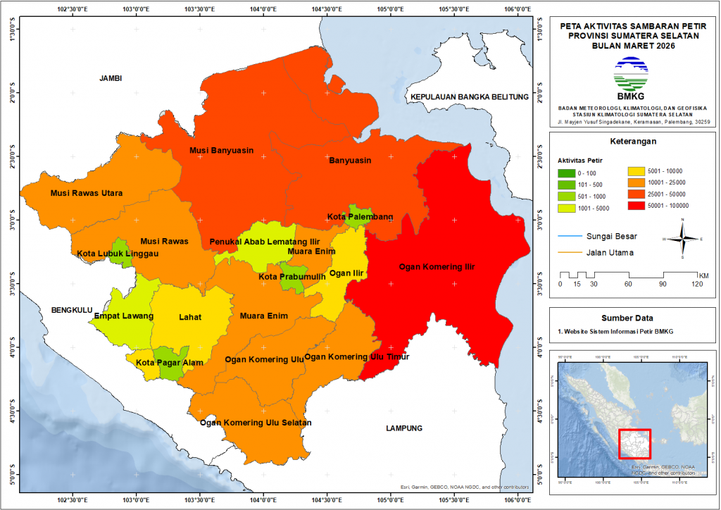 - Wilayah Paling Aktif: Kabupaten Musi Banyuasin, Banyuasin OKU Timur dengan aktivitas 25.001 hingga 100.000 sambaran (warna oranye tua ) , Kabupaten OKI merupakan Wilayah dengan aktivitas paling tinggi dengan >50.000 sambaran ( Warna Merah ) selama bulan Maret.