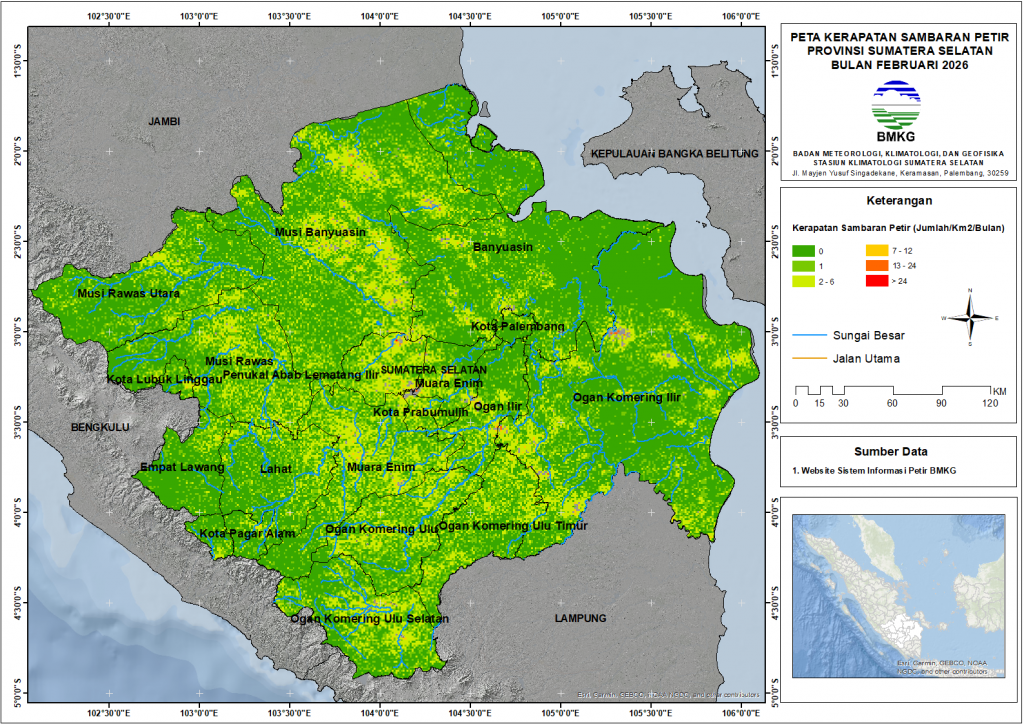 Sambaran petir provinsi Sumatera Selatan bulan Februari 2026