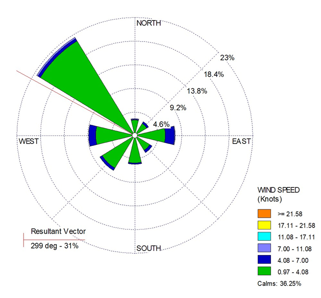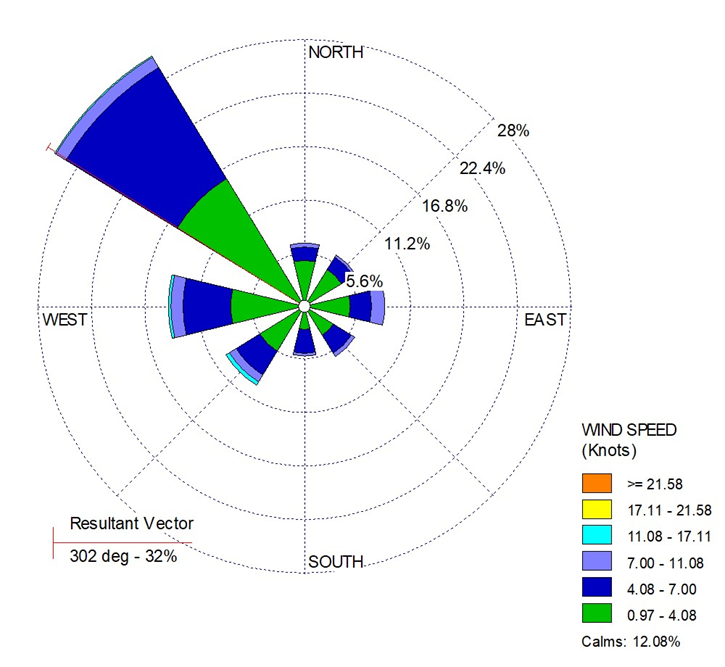 Pada bulan November 2025, arah angin bertiup didominasi dari arah Barat Laut. Kecepatan angin berkisar antara 0.97 – 4.08 knots. Kecepatan angin rata-rata sebesar 0.78 knots atau 1.45 km/jam. Rata-rata arah angin ditunjukkan oleh vektor resultan yaitu dari arah Barat Laut (299⁰ –31%).