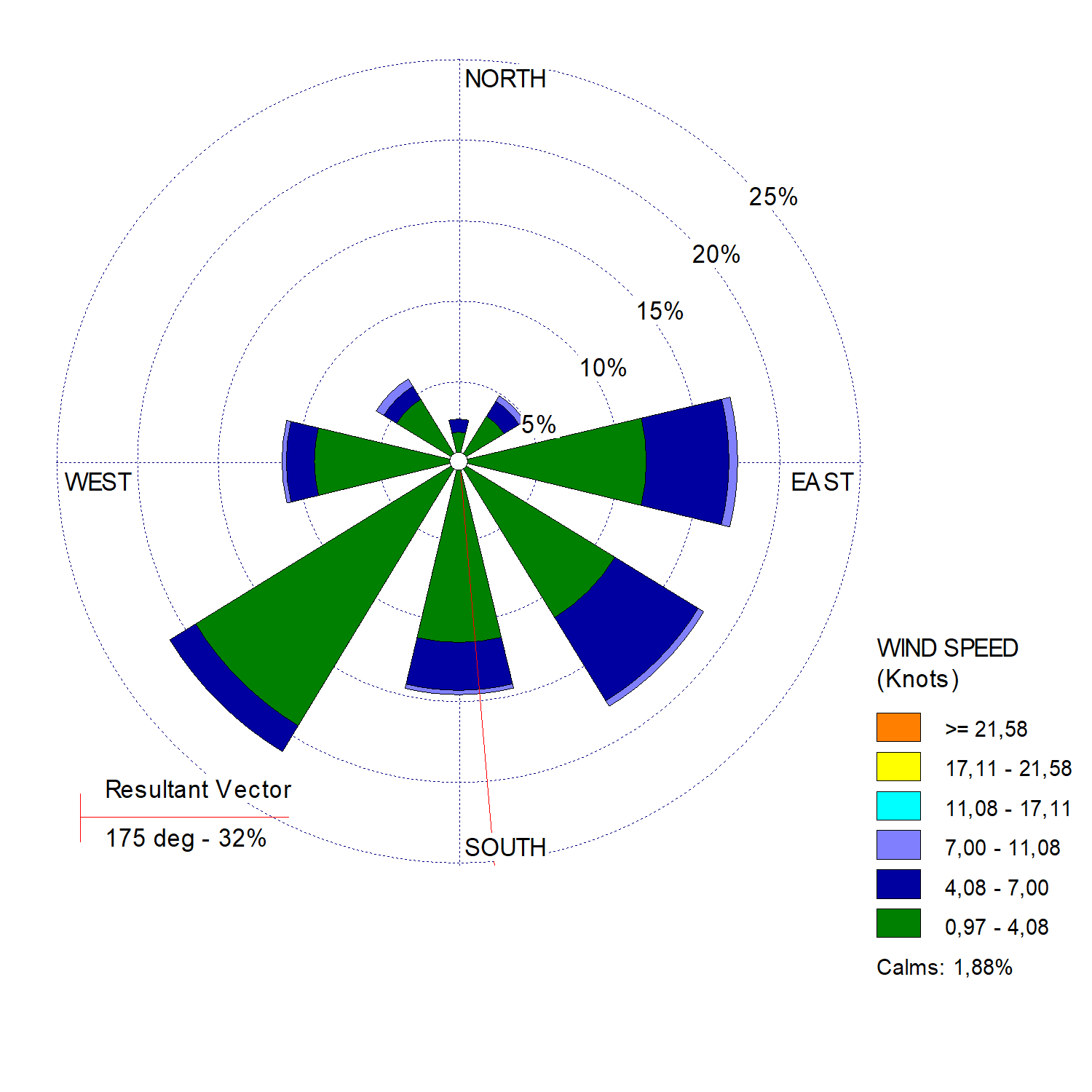 Pada bulan Oktober 2025, arah angin bertiup dominan bertiup dari barat daya. Kecepatan angin rata-rata berkisar antara 0.3–9.7 knots. Kecepatan angin rata-rata sebesar 3.00 knots atau 5.556 km/jam. Rata-rata arah angin ditunjukkan oleh vektor resultan yaitu dari arah selatan (175⁰ – 32%).