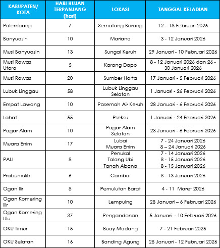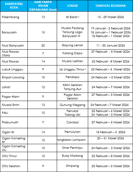 Analisis Analisis HTH HTH Analisis Hari Tanpa Hujan Dan Hari Hujan Bulan Maret 2026 7 April 2026 siska masrury Hasil analisis hari tanpa hujan dan hari hujan terpanjang berdasarkan data curah hujan yang diterima dari Stasiun/Pos hujan kerjasama di wilayah Sumatera Selatan pada tahun 2026 disajikan sebagai berikut: Tabel 1. Hari Tanpa Hujan Terpanjang Tahun 2026 Tabel 2. Hari Hujan Terpanjang Tahun 2026
