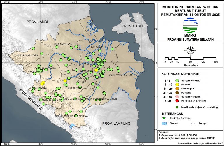 Monitoring Hari Tanpa Hujan (update 10 November 2025)Sebagian besar Sumatera Selatan masih terjadi hujan sampai dengan pemutakhiran data.Sangat Pendek (1-5…