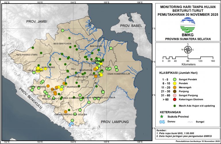 Monitoring Hari Tanpa Hujan (update 30 November 2025) Sebagian besar wilayah Sumatera Selatan masih terjadi hujan sampai dengan pemutakhiran data.Sangat…