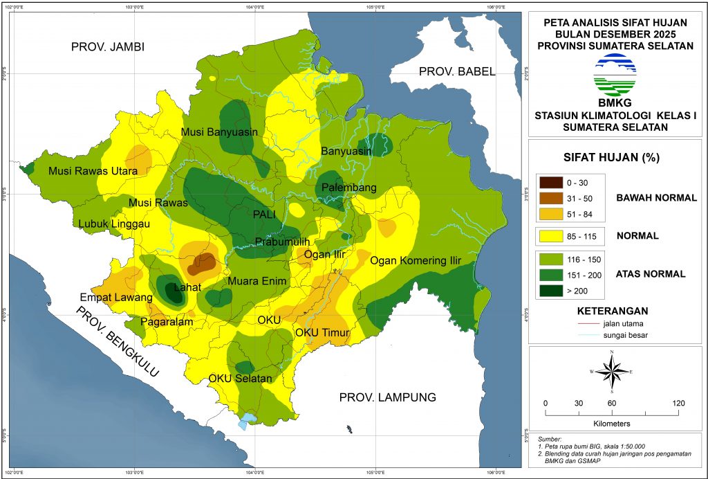 Analisis sifat hujan bulan Desember 2025 menunjukkan bahwa wilayah Sumatera Selatan didominasi sifat hujan Normal hingga Atas Normal. Sifat Hujan Bawah Normal terjadi di Musi Rawas Utara bagian timur, Empat Lawang bagian barat, Pagar Alam bagian utara, Lahat bagian utara, Muara Enim bagian barat, Ogan Ilir bagian selatan, sebagian kecil OKI bagian barat, OKU bagian timur, dan sebagian besar OKU Timur.