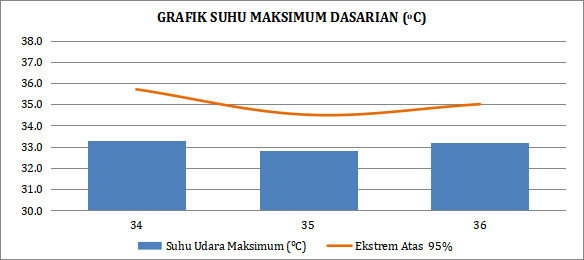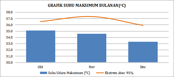 Pada periode Oktober hingga Desember 2025, tidak terjadi kondisi ekstrem pada suhu maksimum. Suhu maksimum absolut tertinggi pada bulan Oktober 2025 yaitu 35.1°C sementara batas ekstremnya berada pada nilai 36.5°C .
