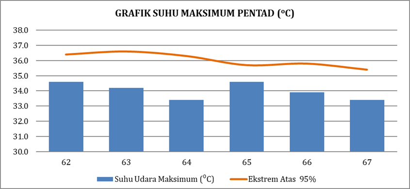 Gambar 1. Perbandingan Suhu Maksimum Absolut Pentad ke-62 hingga 67 Tahun 2025 terhadap Batas Ekstrem 95%