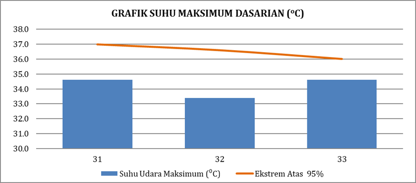 Gambar 2. Perbandingan Suhu Maksimum Absolut Dasarian ke-31 hingga 33 Bulan November Tahun 2025 terhadap Batas Ekstrem 95%