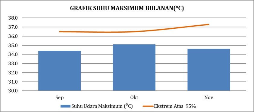 Pada periode September hingga November 2025, tidak terjadi kondisi ekstrem pada suhu maksimum. Suhu maksimum absolut tertinggi pada bulan November 2025 yaitu 35.1°C sementara batas ekstremnya berada pada nilai 36.5°C .