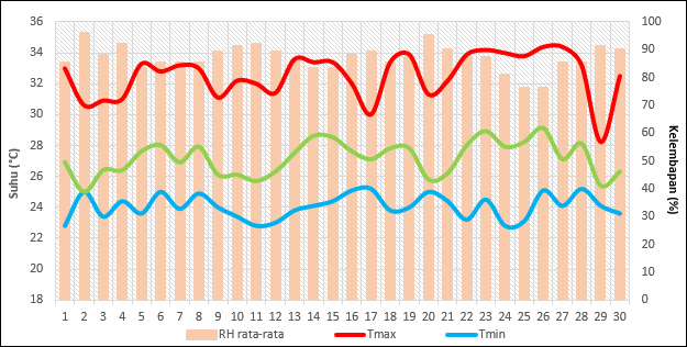 Temperatur maksimum rata-rata bulan September 2025 sebesar 32.5°C. Temperatur maksimum tertinggi terjadi pada tanggal 26 dan 27 September 2025 dengan temperatur 34.4°C dan temperatur maksimum terendah terjadi pada tanggal 29 September 2025 dengan temperatur 28.2°C.