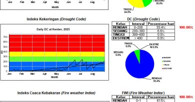 Grafik indeks cuaca kebakaran (FWI) di Stasiun Klimatologi Palembang dari tanggal 1 Januari sampai dengan 31Mei 2020menunjukkan bahwa persentase indeks cuaca kebakaran pada tingkatRendah sebesar 78.9% dan pada tingkatSedang sebesar 21.1%. Sedangkan untuk bulan Mei 2020, indeks FWI tercatat pada tingkatRendah tercatat sebesar 83.9% dan pada tingkatSedang tercatat sebesar 16.1%.