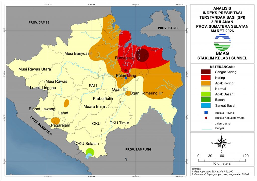 Analisis tingkat kekeringan pada bulan Maret 2026 dengan metode SPI menunjukkan bahwa sebagian besar wilayah Sumatera Selatan dalam kondisi Normal, kecuali sebagian kecil OKU Selatan bagian selatan berada pada kondisi Agak Basah. Sementara sebagian kecil Lahat bagian utara, Pagar Alam bagian barat, Musi Banyuasin bagian timur, sebagian besar Banyuasin, Palembang, Ogan Ilir bagian utara, dan OKI bagian utara berada pada kondisi Agak Kering hingga Sangat Kering.