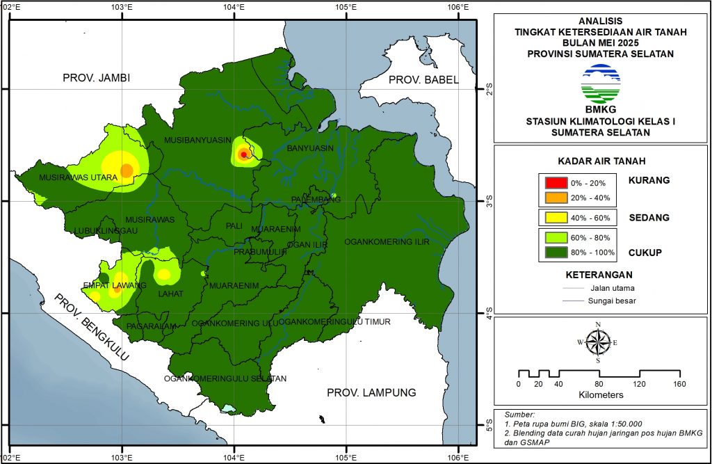 Hasil analisis tingkat ketersediaan air tanah berdasarkan masukan data curah hujan yang diterima dari stasiun/pos hujan kerjasama di Sumatera Selatan pada bulan Mei 2025 disajikan sebagai berikut: