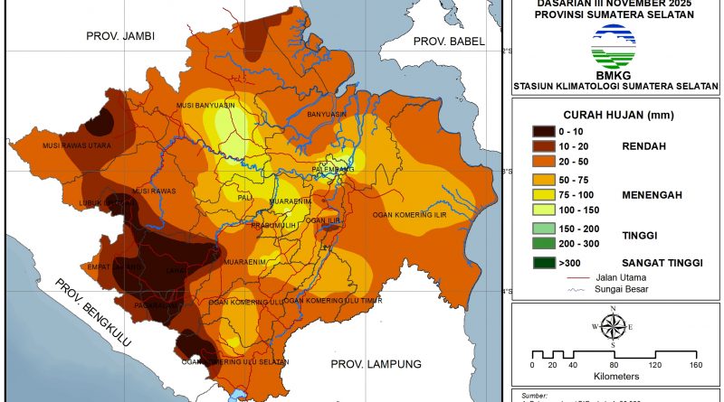 Distribusi Curah Hujan Dasarian III November 2025 Rendah (0-50 mm): sebagian besar wilayah Sumatera Selatan.Menengah (50-150 mm): Palembang, sebagian Musi