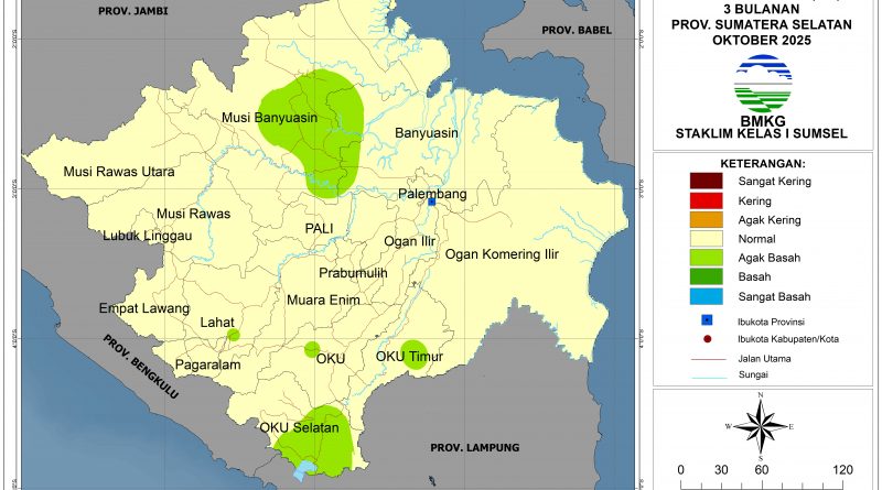 Baca SelengkapnyaAnalisis sifat hujan bulan Oktober 2025 menunjukkan bahwa wilayah Sumatera Selatan didominasi sifat hujan Normal. Sifat hujan Bawah Normal terjadi di Muratara bagian