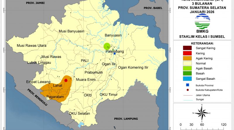 Analisis tingkat kekeringan pada bulan Januari 2026 dengan metode SPI menunjukkan bahwa sebagian besar wilayah Sumatera Selatan mengalami kondisi Normal kecuali di