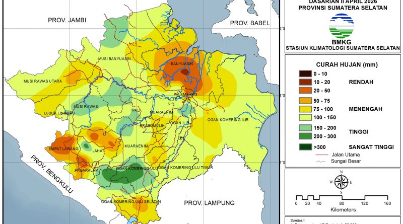 Distribusi Curah Hujan Dasarian II April 2026Rendah (0-50 mm): Palembang bagian utara, Banyuasin bagian tengah, Empat Lawang bagian tengah, sebagian
