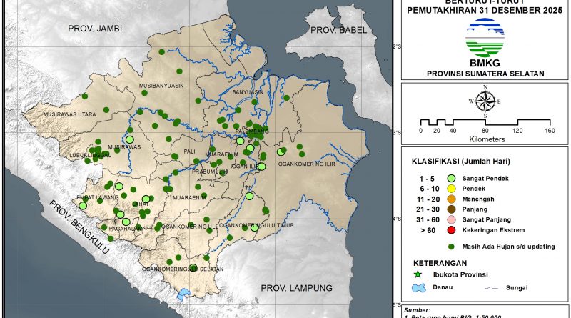 Baca SelengkapnyaMonitoring Hari Tanpa Hujan (update 31 Desember 2025) Sebagian besar wilayah Sumatera Selatan masih terjadi hujan sampai dengan pemutakhiran data.Sangat