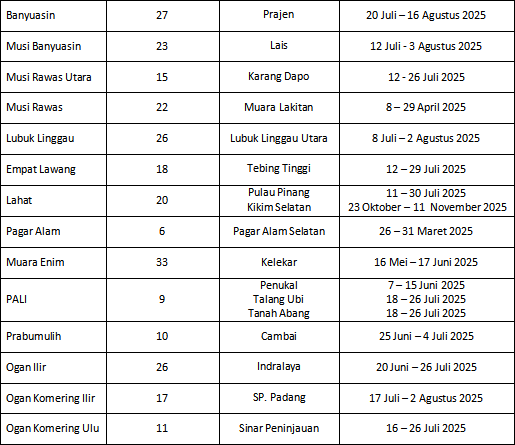 Baca SelengkapnyaMonitoring Hari Tanpa Hujan (update 20 Desember 2025)Sebagian besar wilayah Sumatera Selatan masih terjadi hujan sampai dengan pemutakhiran data.Sangat Pendek