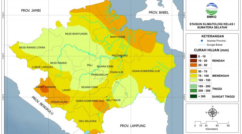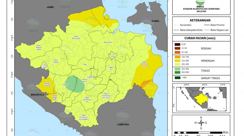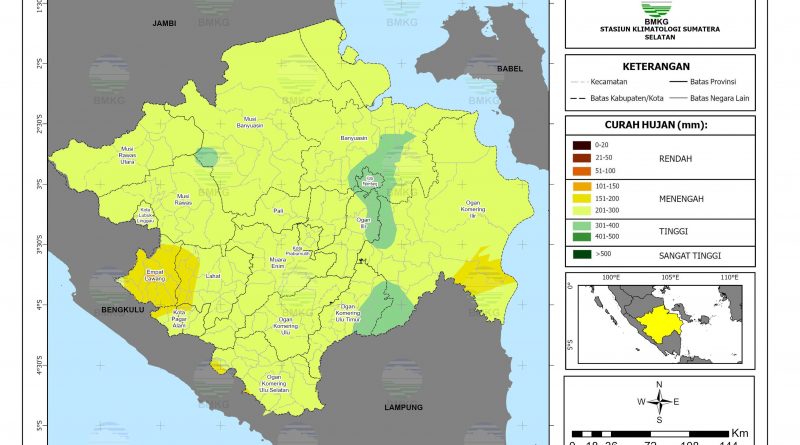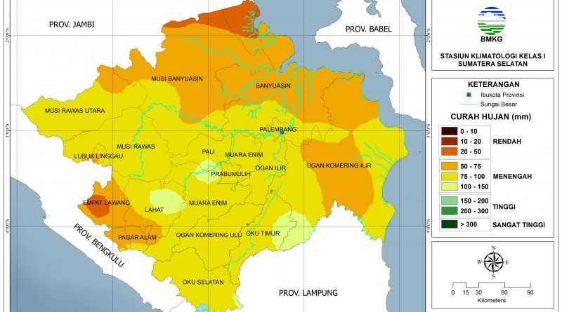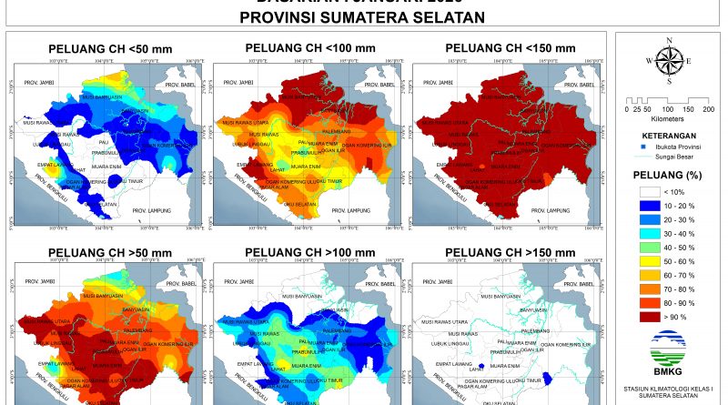 Pada Januari 2026, sebagian wilayah Sumatera Selatan diprediksi mendapatkan curah hujan dengan kategori Menengah (151–300 mm). Sementara wilayah lainnya meliputi sebagian