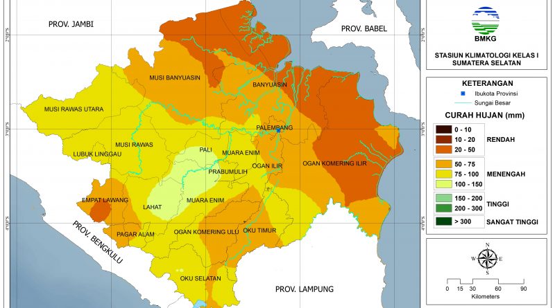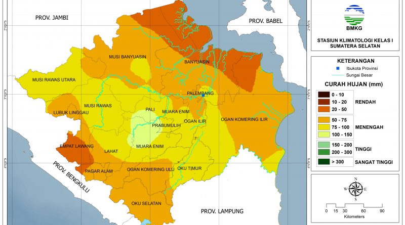 Prediksi Curah Hujan Dasarian III Januari 2026Rendah (0-50 mm): sebagian Musi Banyuasin bagian utara, sebagian Banyuasin bagian utara, sebagian OKI.Menengah