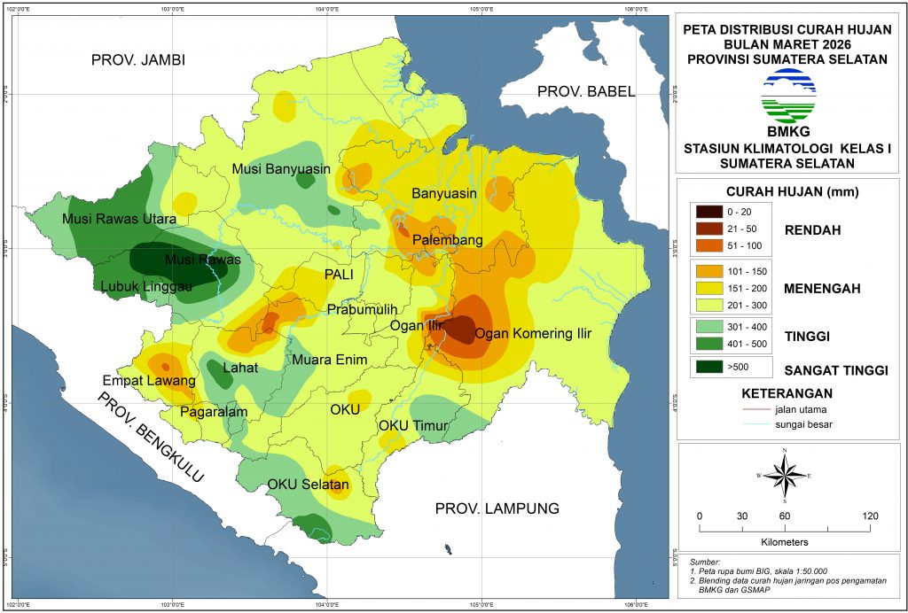 Pada bulan Maret 2026, distribusi curah hujan di sebagian besar wilayah Sumatera Selatan berada pada kategori Menengah (101–300 mm). Curah hujan dengan kategori Tinggi (301-500 mm) hingga Sangat Tinggi (>500 mm) terjadi di sebagian besar Musi Rawas, Musi Rawas Utara dan OKU Selatan, sebagian kecil Musi Banyuasin, Banyuasin, Lahat, Muara Enim, Pagar Alam, OKI, OKU Timur. Sedangkan curah hujan dengan kategori Rendah (21-100 mm) terjadi di sebagian kecil Muara Enim, Banyuasin, OKI dan Empat Lawang.