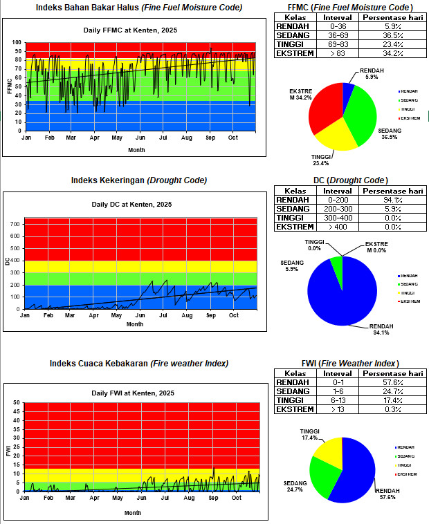 Sistem peringatan kebakaran hutan di Sumatera Selatan menggunakan tiga indikator utama yang bekerja seperti termometer untuk mengukur risiko kebakaran. Ketiga indikator ini—Fine Fuel Moisture Code (FFMC), Drought Code (DC), dan Fire Weather Index (FWI)—masing-masing memiliki peran khusus dalam mendeteksi tingkat bahaya kebakaran berdasarkan kondisi cuaca dan kelembapan bahan bakar di hutan. Data terbaru dari Stasiun Klimatologi Sumatera Selatan menunjukkan pola yang cukup mengkhawatirkan, terutama pada bulan September hingga Oktober 2025 yang menandai peningkatan signifikan risiko kebakaran di wilayah tersebut. Hal ini erat kaitannya dengan klimatologis wilayah dimana temperatur udara cukup tinggi, kelembaban udara dan curah hujan yang rendah.