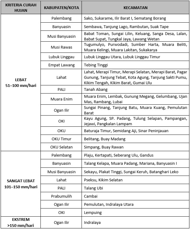 Iklim Ekstrem Informasi Curah Hujan Ekstrem Bulan Desember Tahun 2025 6 Januari 2026 winesty dewi Tabel Hujan Ekstrem Informasi curah hujan ekstrem yang terjadi pada bulan Desember 2025 berdasarkan data curah hujan yang diterima dari stasiun/pos hujan kerjasama di wilayah Sumatera Selatan disajikan pada tabel berikut: