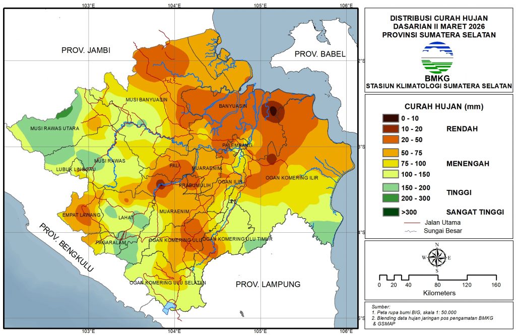 Tinggi (150-300 mm): sebagian Musi Rawas Utara, Musi Rawas bagian tengah, sebagian Lahat, Pagar Alam bagian barat, dan selatan OKI.