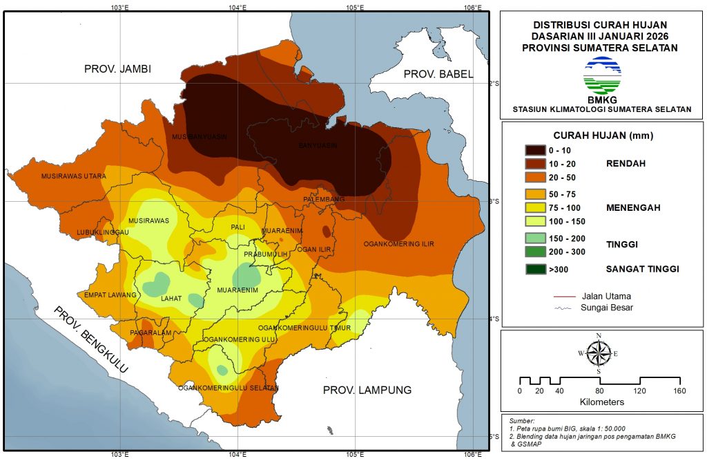 Rendah (0-50 mm): sebagian besar wilayah Sumatera Selatan bagian utara hingga barat dan OKU Selatan bagian timur.