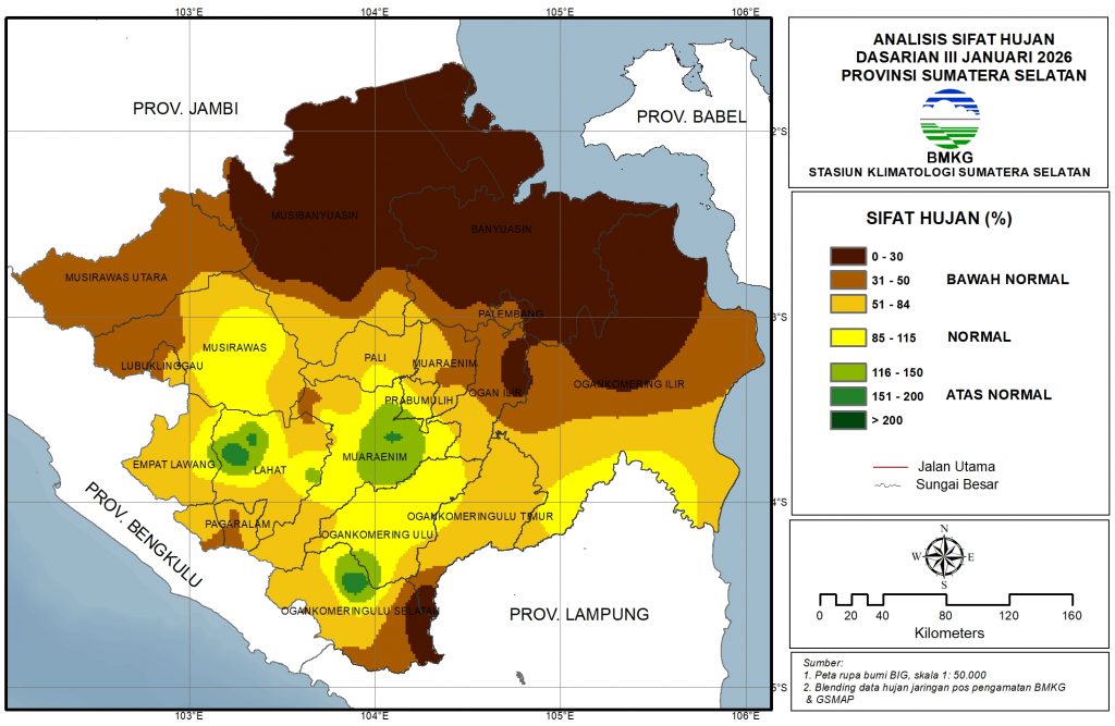 Bawah Normal: sebagian besar wilayah Sumatera Selatan.