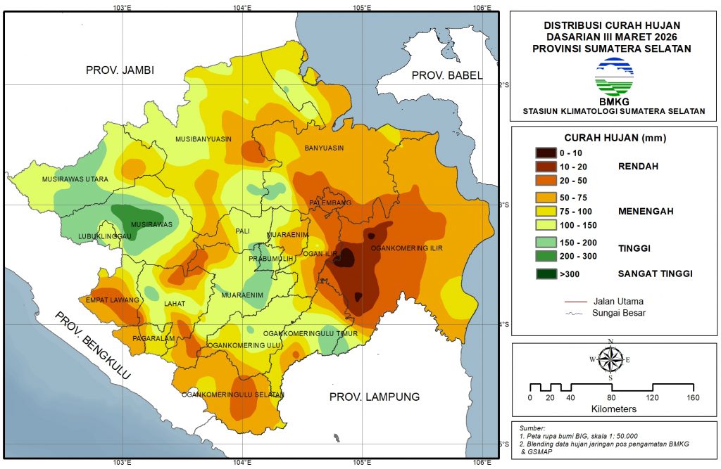 Rendah (0-50 mm): wilayah Palembang, sebagian besar OKI, sebagian Banyuasin bagian tenggara, sebagian kecil Musi Banyuasin bagian timur, sebagian OKU Selatan, sebagian kecil Muara Enim bagian selatan, sebagian kecil Lahat bagian utara dan selatan, serta sebagian Empat Lawang.