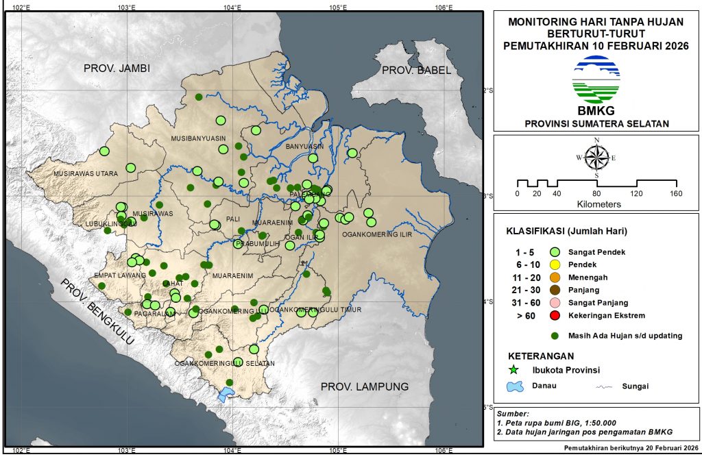 Sebagian Sumatera Selatan masih terjadi hujan sampai dengan pemutakhiran data, sementara lainnya mengalami Hari Tanpa Hujan dengan kategori Sangat Pendek (1-5 hari).
