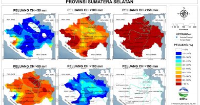 Prakiraan Curah Hujan Dasarian I November 2021 Rendah (0-50 mm): tidak ada. Menengah (50-150 mm): seluruh wilayah di Provinsi Sumatera Selatan. Tinggi (150-300 mm): sebagian kecil Musi Rawas Utara dan barat laut OKU Selatan. Sangat Tinggi (>300 mm): tidak ada.