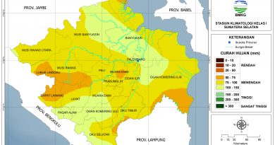 Peluang >20% terjadi CH Tinggi (150-300 mm): sebagian kecil Musi Rawas, sebagian kecil OKI bagian selatan, dan sebagian kecil OKU.