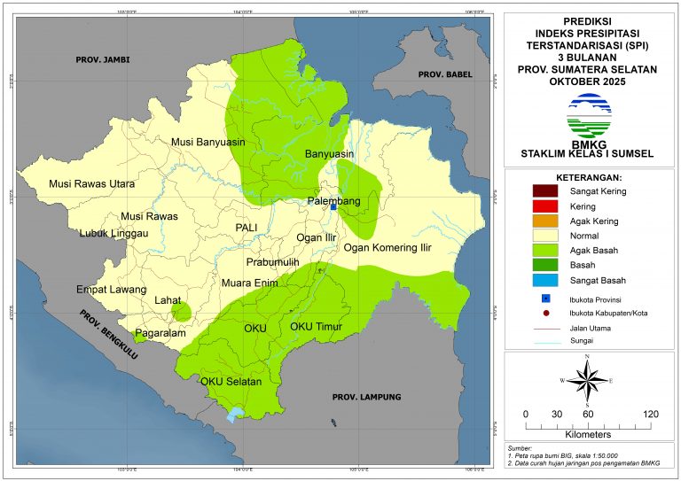 Pada bulan Oktober 2025, tingkat kekeringan di sebagian besar wilayah Sumatera Selatan diprediksi berada pada kondisi Normal. Wilayah Musi Banyuasin bagian timur, sebagian besar Banyuasin, sebagian OKI, Ogan Ilir, sebagian kecil Muara Enim, Lahat, Pagar Alam, seluruh wilayah OKU Timur, OKU, dan OKU Selatan diprediksi berada pada kondisi Agak Basah.