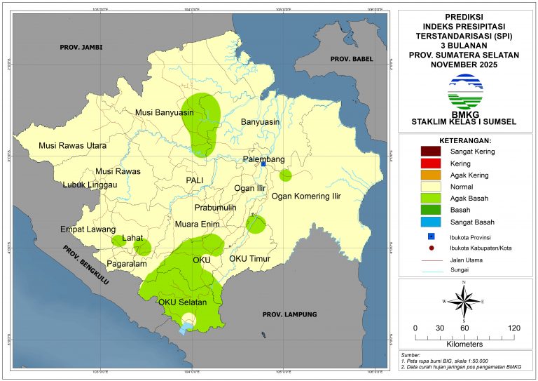 Pada bulan November 2025, tingkat kekeringan di sebagian besar wilayah Sumatera Selatan diprediksi berada pada kondisi Normal. Sebagian wilayah Musi Banyuasin, sebagian OKU, OKU Selatan, sebagian kecil Lahat, sebagian kecil OKU Timur, dan sebagian kecil OKI diprediksi berada pada kondisi Agak Basah.
