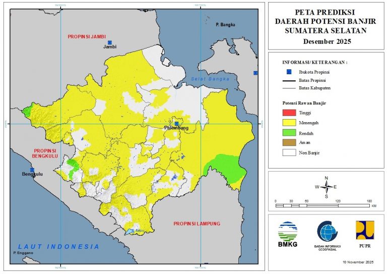 Prediksi Daerah Potensi Banjir Provinsi Sumatera Selatan Periode Desember 2025 – Februari 2026 (Update 10 November 2025)