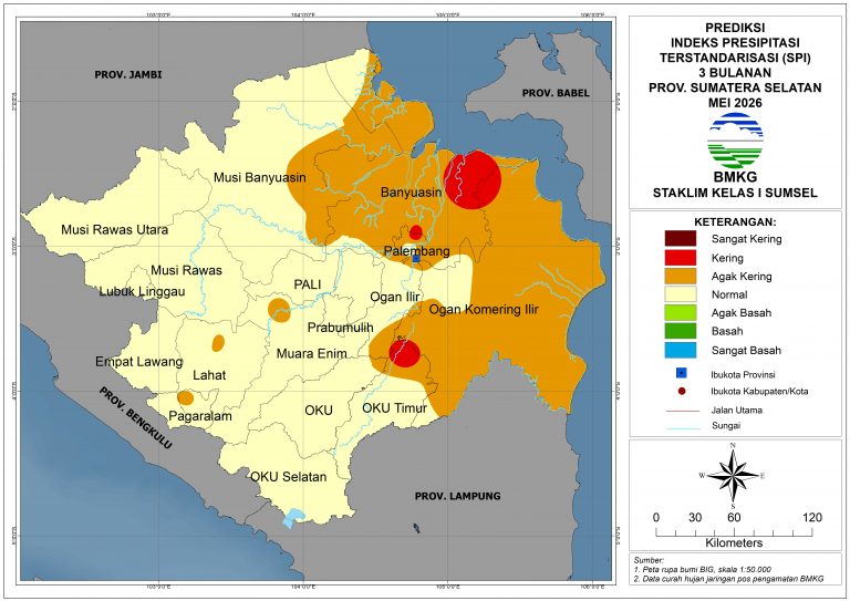 Pada bulan Mei 2026, tingkat kekeringan di sebagian besar wilayah Sumatera Selatan diprediksi berada pada kondisi Normal, kecuali sebagian kecil Lahat bagian utara, Pagar Alam bagian barat, Muara Enim bagian barat, Musi Banyuasin bagian timur, sebagian besar Banyuasin, sebagian besar Palembang, Ogan Ilir bagian selatan, sebagian besar OKI, dan OKU Timur bagian utara diprediksi berada…