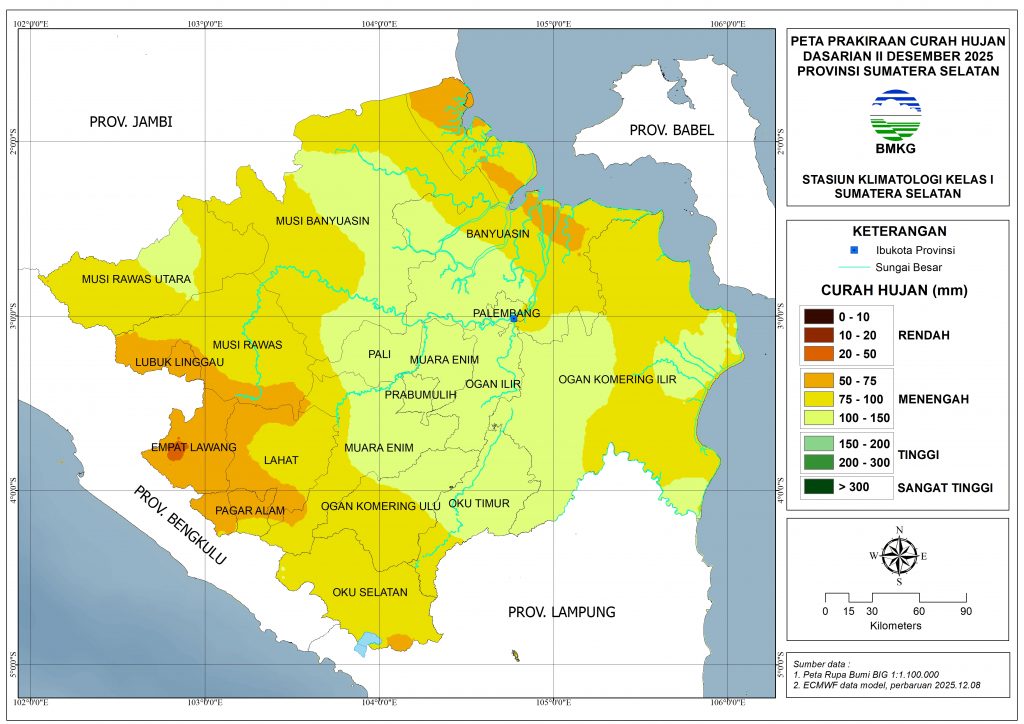 KONDISI TERKINI IKLIM SUMSELCurah hujan pada dasarian II Desember 2025 di sebagian besar wilayah sumatera selatan berada pada kategori Menengah