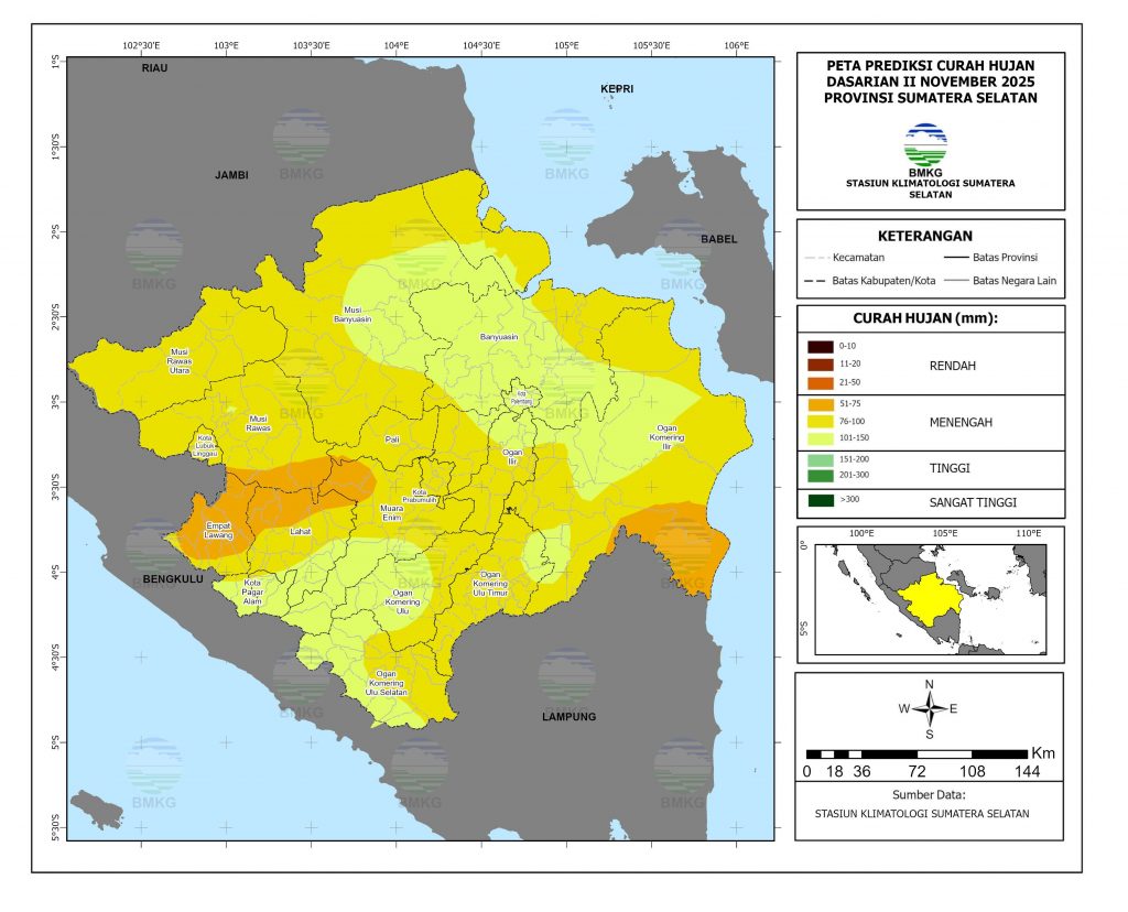 Prediksi Curah Hujan Dasarian II November 2025 Rendah (0-50 mm) : tidak ada. Menengah (51-150 mm) : Seluruh wilayah Sumatera Selatan Tinggi (151-300 mm) : tidak ada. Sangat Tinggi (>300 mm) : tidak ada.