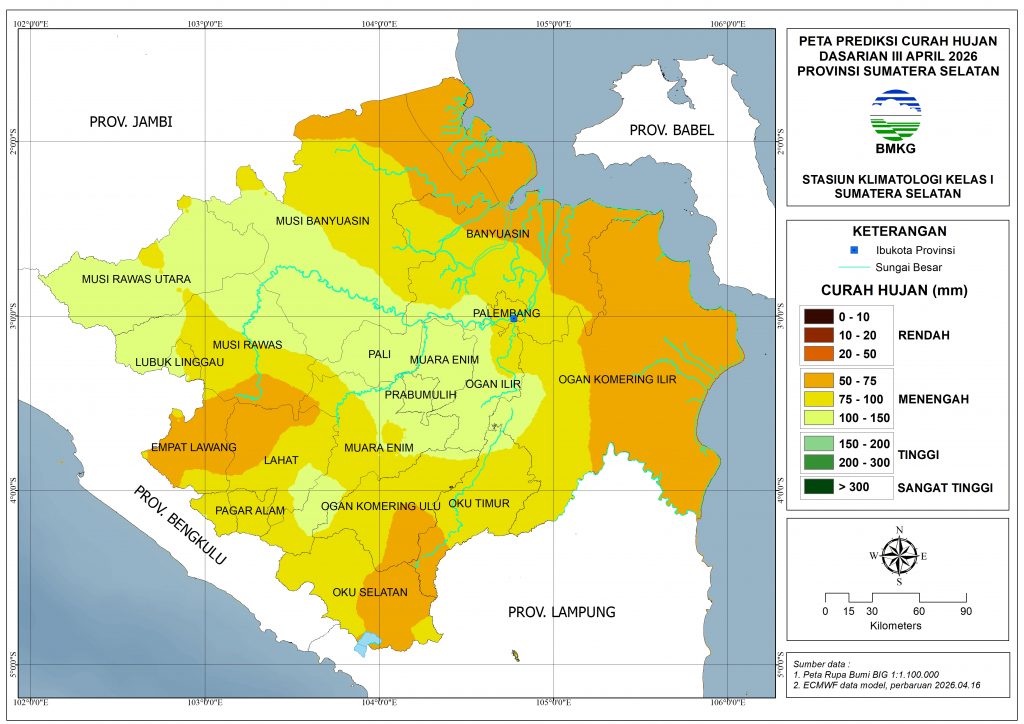 Prakiraan Prakiraan Dasarian Prediksi Curah Hujan Dasarian III April 2026 (update 20 April 2026) 20 April 202620 April 2026 rezfiko agdialta Prediksi Curah Hujan Dasarian III April 2026Rendah (0-50 mm): tidak ada.Menengah (51-150 mm): Seluruh wilayah Sumatera Selatan.Tinggi (151-300 mm): tidak ada.Sangat Tinggi (>300 mm): tidak ada.
