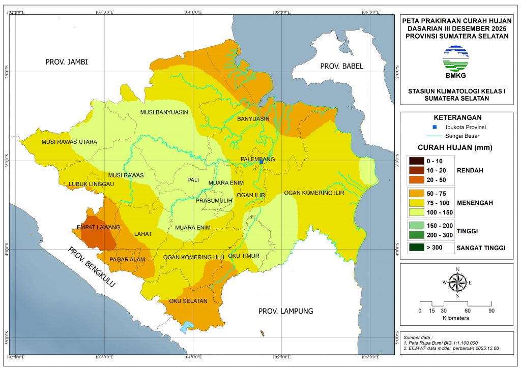 Prakiraan Prakiraan Dasarian Prediksi Curah Hujan Dasarian III Desember 2025 (update 10 Desember 2025) 10 Desember 202519 Desember 2025 dara kasihairani Prediksi Curah Hujan Dasarian III Desember 2025Rendah (0-50 mm): Empat Lawang bagian barat.Menengah (51-150 mm): sebagian besar wilayah Sumatera Selatan.Tinggi (151-300 mm): tidak ada.Sangat Tinggi (>300 mm): tidak ada.