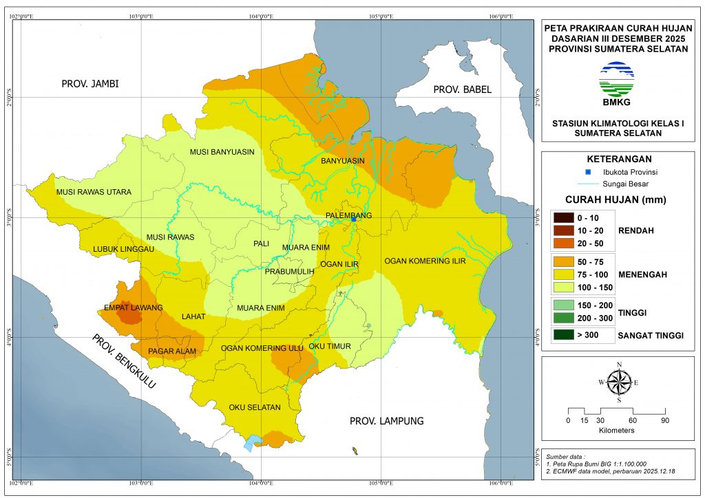 INFORMASI IKLIM DASARIAN PROVINSI SUMATERA SELATAN UPDATE 10 DESEMBER 2025PELUANG HUJAN MASIH CUKUP TINGGI PADA DASARIAN II DESEMBER 2025, TETAP WASPADA TERHADAP POTENSI KEJADIAN EKSTREM DAN BENCANA HIDROMETEOROLOGI