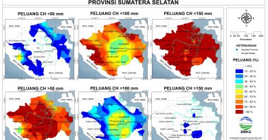 Prediksi Curah Hujan Dasarian III Maret 2025 Rendah (0-50 mm): sebagian besar Empat Lawang, Lahat bagian barat, dan Pagar Alam. Menengah (50-150 mm): sebagian besar wilayah Sumatera Selatan. Tinggi (150-300 mm): tidak ada. Sangat Tinggi (>300 mm): tidak ada.