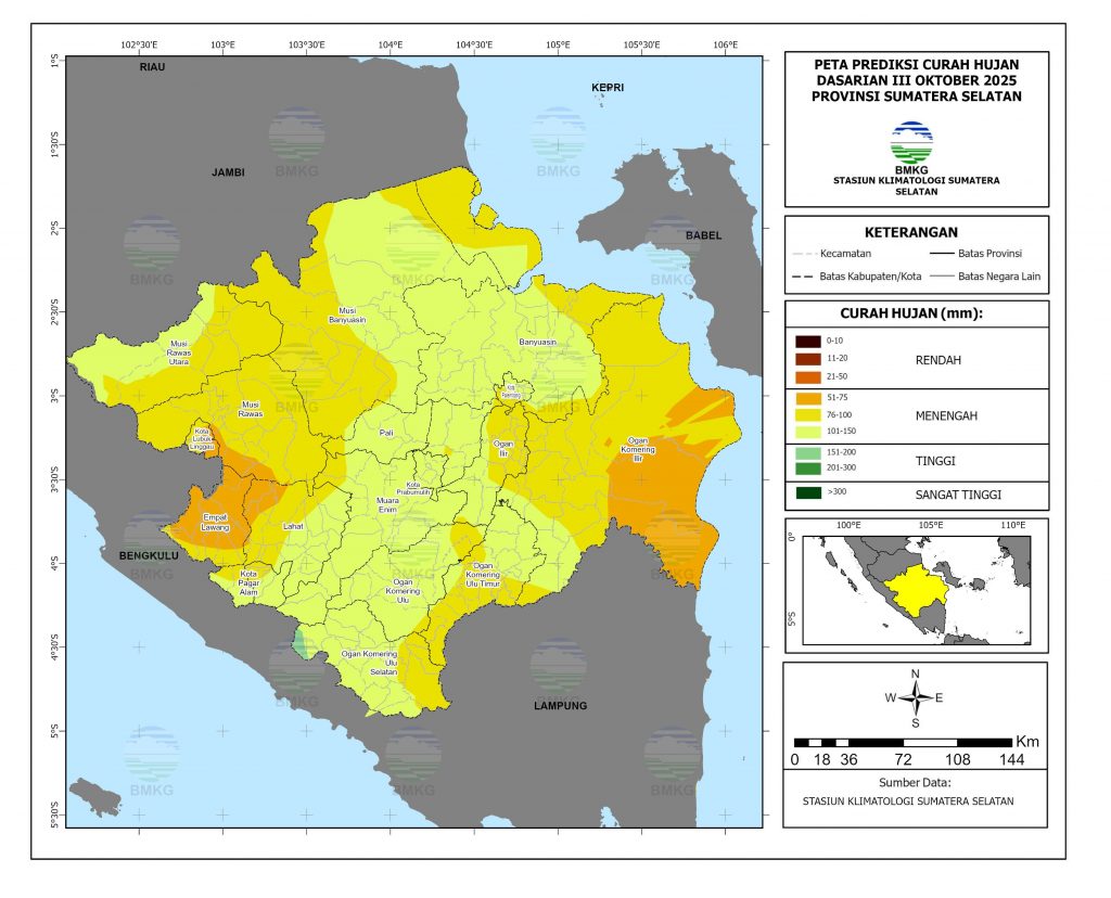 • INFORMASI IKLIM DASARIAN PROVINSI SUMATERA SELATAN UPDATE 10 OKTOBER 2025PELUANG HUJAN DI SEBAGIAN WILAYAH SUMATERA SELATAN PADA DASARIAN II OKTOBER 2025 DIPREDIKSI MENGALAMI PENINGKATAN, TETAP WASPADA TERHADAP POTENSI KEJADIAN EKSTREM DAN BENCANA HIDROMETEOROLOGI