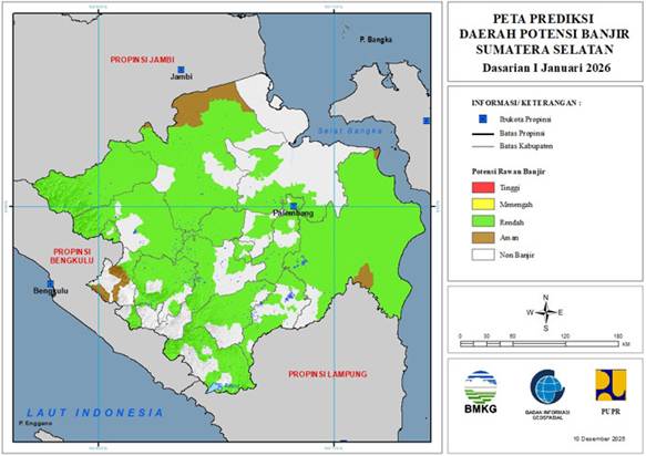 - Prakiraan Daerah Potensi Banjir Provinsi Sumatera Selatan Dasarian I Januari 2026