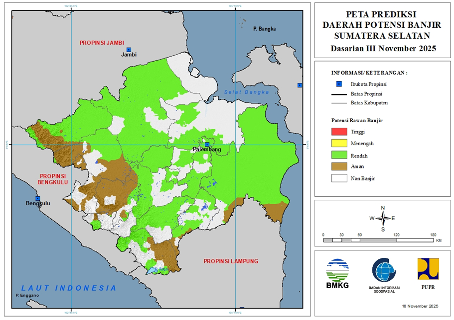Prediksi Daerah Potensi Banjir Provinsi Sumatera Selatan Dasarian III November 2025