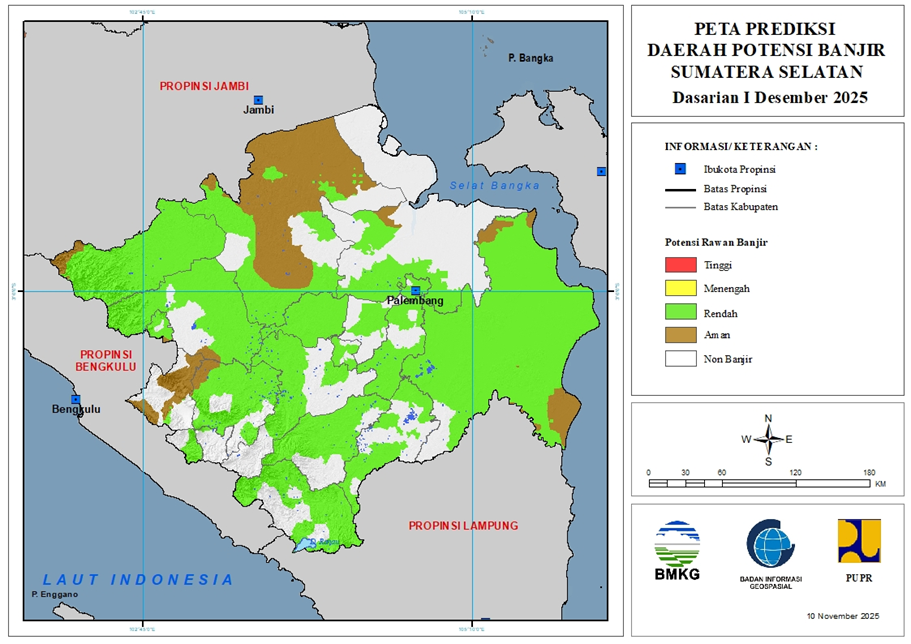 Prediksi Daerah Potensi Banjir Provinsi Sumatera Selatan Dasarian I Desember 2025