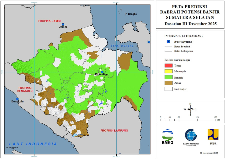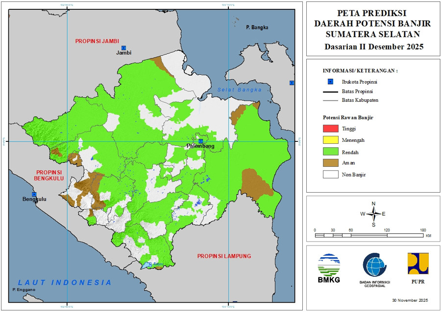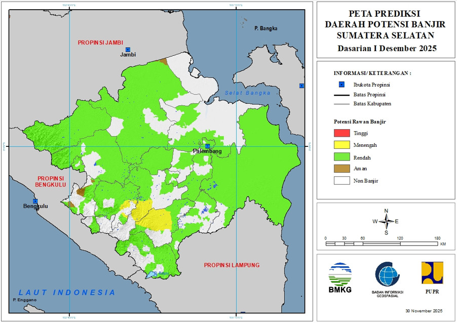 Prediksi Daerah Potensi Banjir Dasarian Provinsi Sumatera Selatan (Update 30 November 2025)