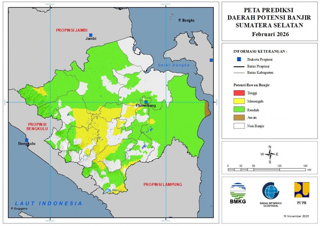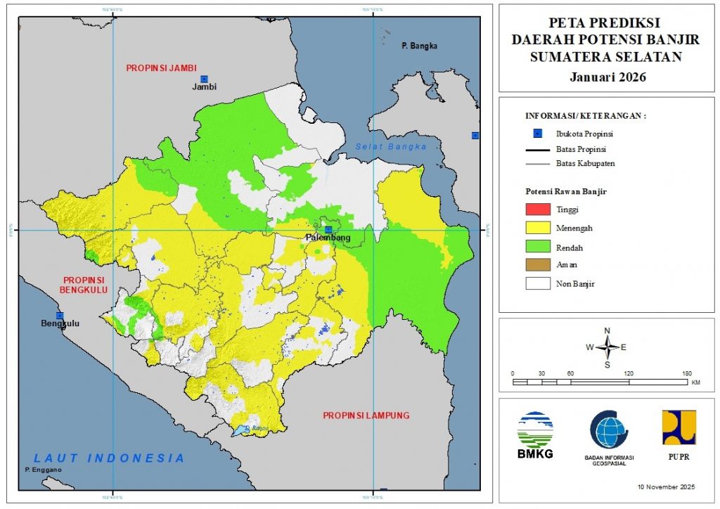 Prediksi Daerah Potensi Banjir Provinsi Sumatera Selatan Periode Desember 2025 – Februari 2026 (Update 10 November 2025)